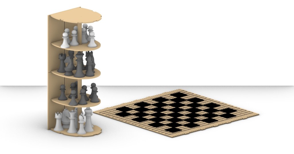 For this project, I created a 3D printed chess set with a wooden laser cut board and container for my Form final project. I used Rhino software for 3D modeling and rendering the pieces, along with Illustrator to design the board other wooden pieces. The idea behind this project was the have the board laser cut in such a way that the wood would bend around and and act as the walls of the storage container while also functioning as the board for playing chess.