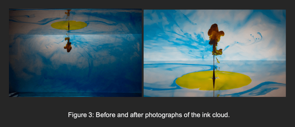 The figure above depicts the apparatus that we used to obtain my image. We used a 24x12x12 inch aquarium provided by Prof. Hertzberg. We filled a small syringe with about 2mL of the black ink and held is at the bottom of the aquarium on the left side. I placed my desk lamp with an LED light bulb on the right side of the tank to illuminate the ink at 90° angle relative to the direction that the camera pointed. The ink flow captured in the final photograph is about 5.5 inches in length by using the tip of the syringe for scale (which was cropped out in the final image) and was taken very shortly after I began to press on the syringe. The ink cloud is moving towards the right due to the force of push exerted by the end of the syringe.
