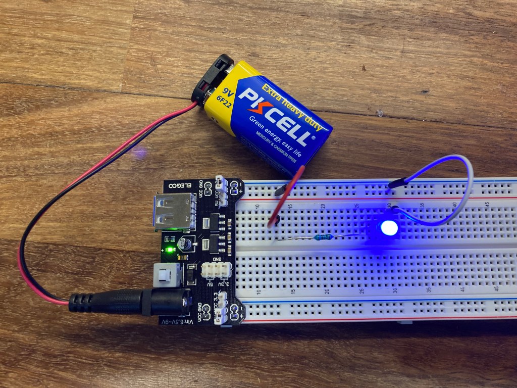 To understand the basics of current flow and setup of electronics, I used the Arduino starter kit to create a circuit that powers a small LED. using the breadboard as a base and a power supply module. Two types of circuits were made using a 5V and 3.3V power supply from the power module connected to a 9V battery. Then using the wires and correct resistor, the circuit would power a small LED light.