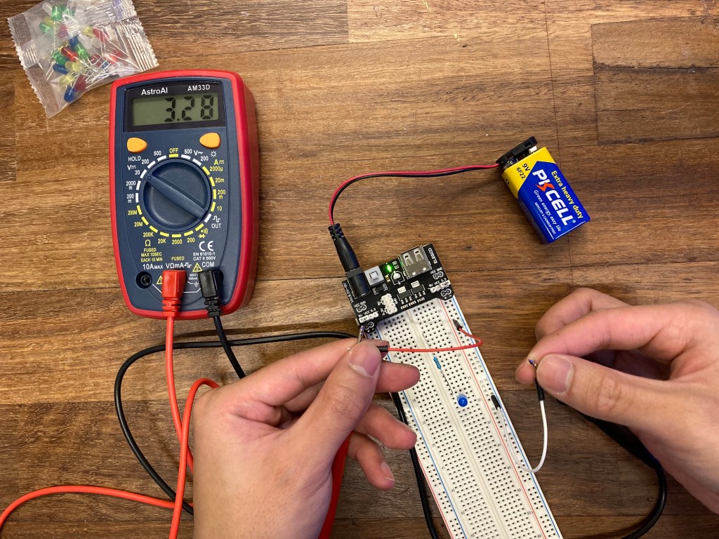 Once the circuit was set up, I used the Multimeter to check the voltage of the power supply. The reading was 3.28 Volts due to the unstable connection between the jumper wires and my fingers holding the wires.