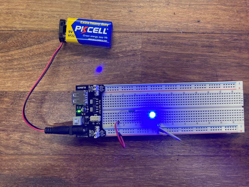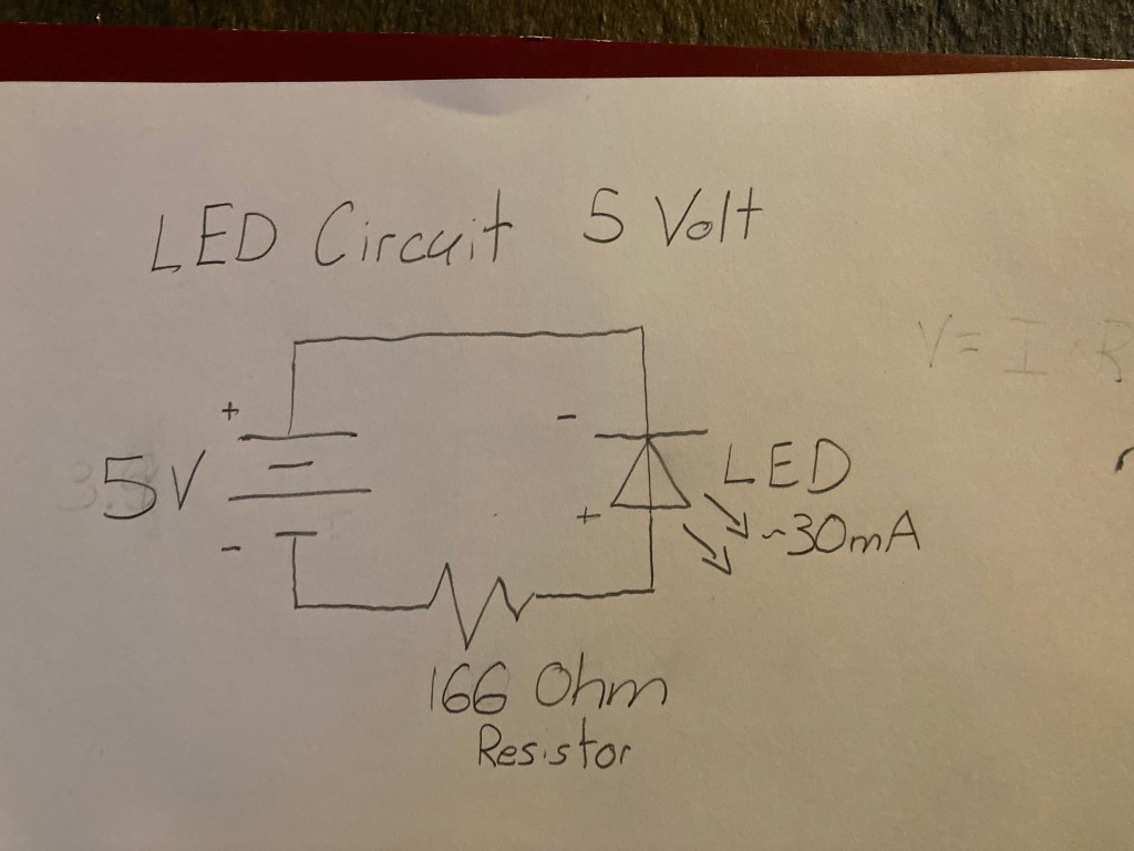 Using Ohm’s Law again, the required resistance calculated was 166.66 Ohms. Again, since the kit does not have the specific resistor, a 100 Ohm resistor was used again.