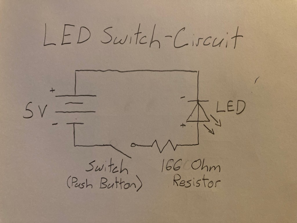My thought process behind this circuit was to create path of least resistance when the the button is activated. When the circuit is ‘broken’ while the button is not being pushed, the current should flow through the LED. But when the button is pushed, the current should flow through a different path from LED in order to turn off the LED. By creating a parallel circuit with the button and LED, a junction is created to divert the flow of electricity depending on the state of button. The LED has greater resistance than the button, so the electrons will follow the path of least resistance when the button is activated.