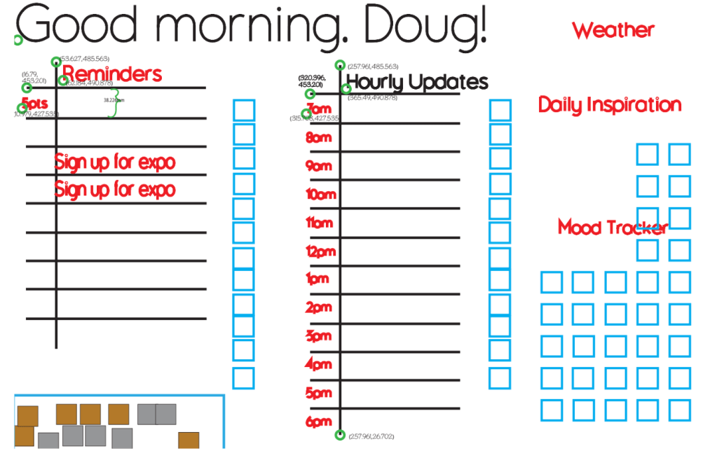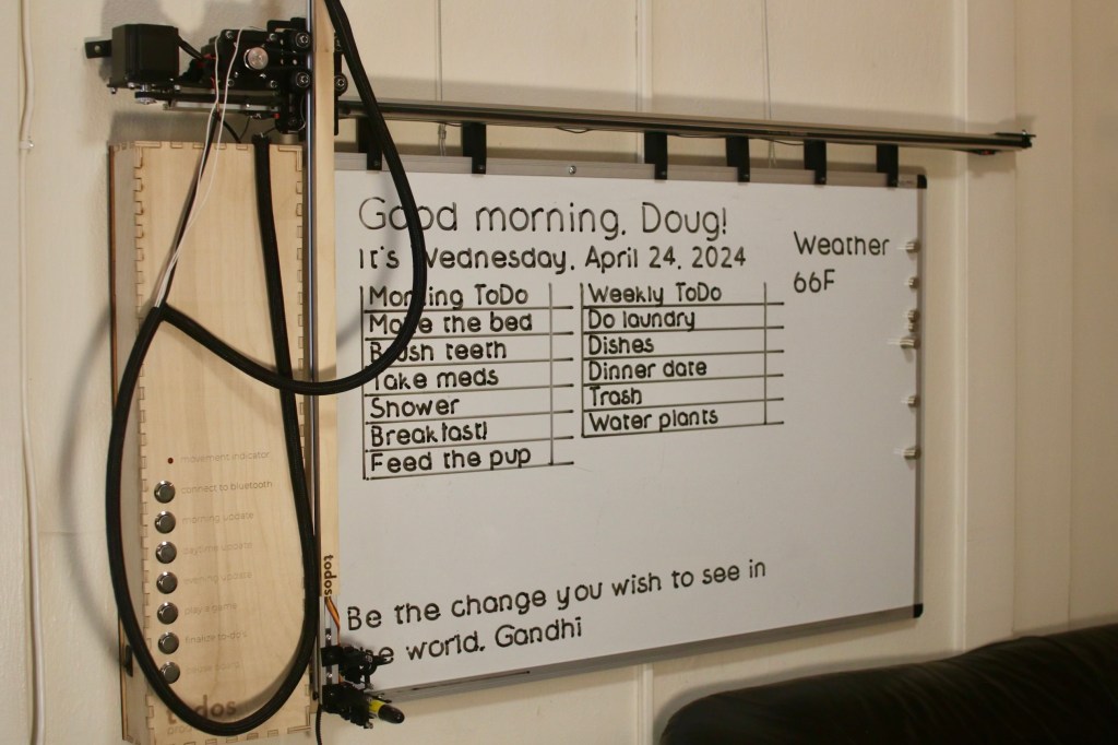 The intended audience for our project are those who struggle with ADHD or those who seek an alternative to digital interfaces for creating a schedule of events, weekly calendar items, and overall daily organization. The automated writing process allows the board to function as a message board to display items that need to get done. Using a whiteboard allows for a person to move magnets into the checkboxes to signify the accomplishment of tasks, in which the board responds with fun drawings to keep the user motivated and feeling rewarded. A physical product for productivity gives the user more room for engagement in finishing tasks that can proudly be displayed in the real world.