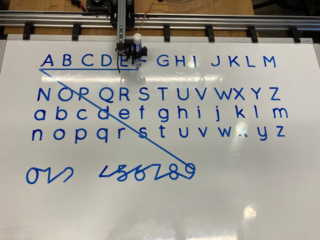 In the early phase of the building process, I contributed to designing a test font of G-code letters for the CNC arms to plot when to move in the x and y axis. We used a GRBL library stored on the Adafruit Metro Mini 328P microcontroller that would take in these lines of code and move the arms in the desired direction to form letters and graphics. First, I used Inkscape to create a character or drawing. Then using the extensions for G-code tools would, I was able to obtain