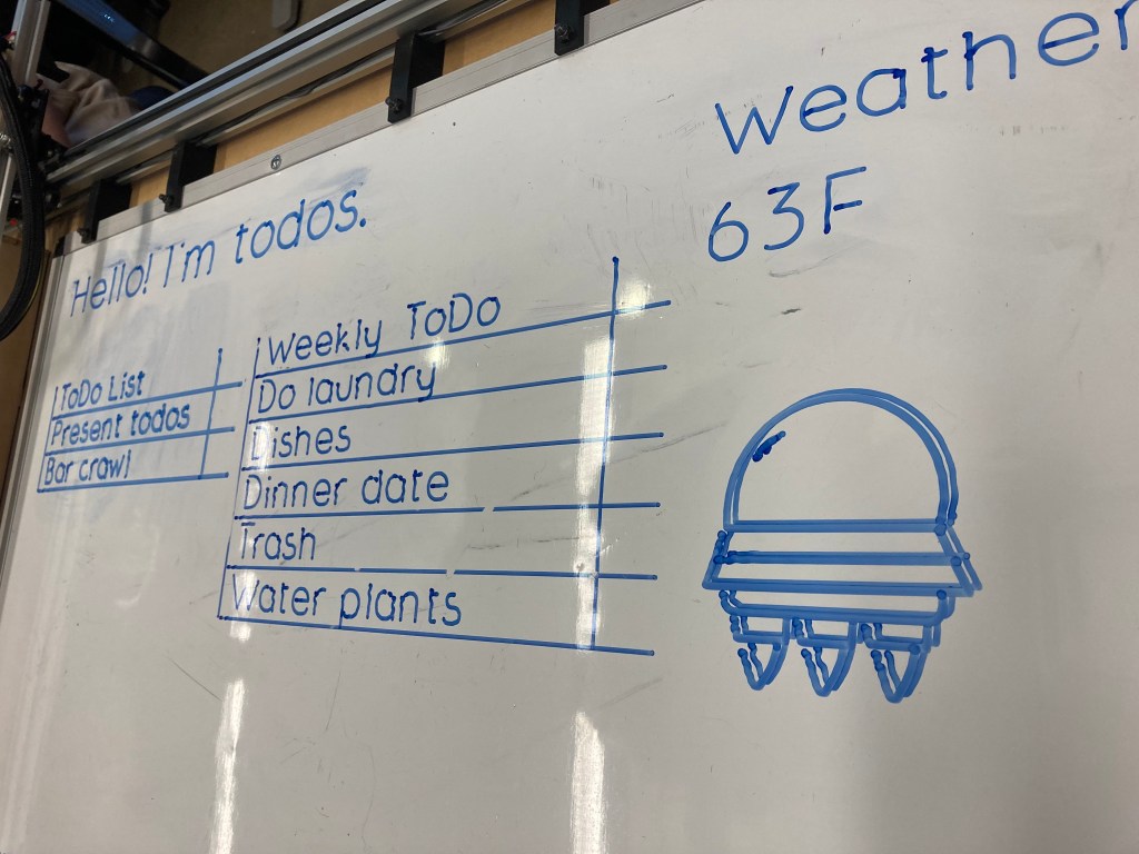 The development of this project let me see the unlimited possibility that an automated writing board can have for future iterations. The black canvas of the whiteboard allows for so many possibilities in terms of customization and incorporation of newer features. Wifi connectivity opens the door for more features to be added through API’s and connecting with existing digital workspaces, allowing more opportunity to bring those ideas to the tactile and real world on the TODOS board.