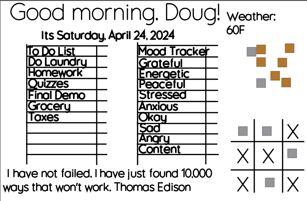 The board utilizes an Arduino UNO R4 Wifi that connects to a web portal that allows for users to customize their board experience. The portal allows users to create a profile and enter in the items they want to accomplish throughout the week. The time is programmed into the Arduino microcontroller to allow for a morning, afternoon, and evening update as the list of tasks changes throughout the day.