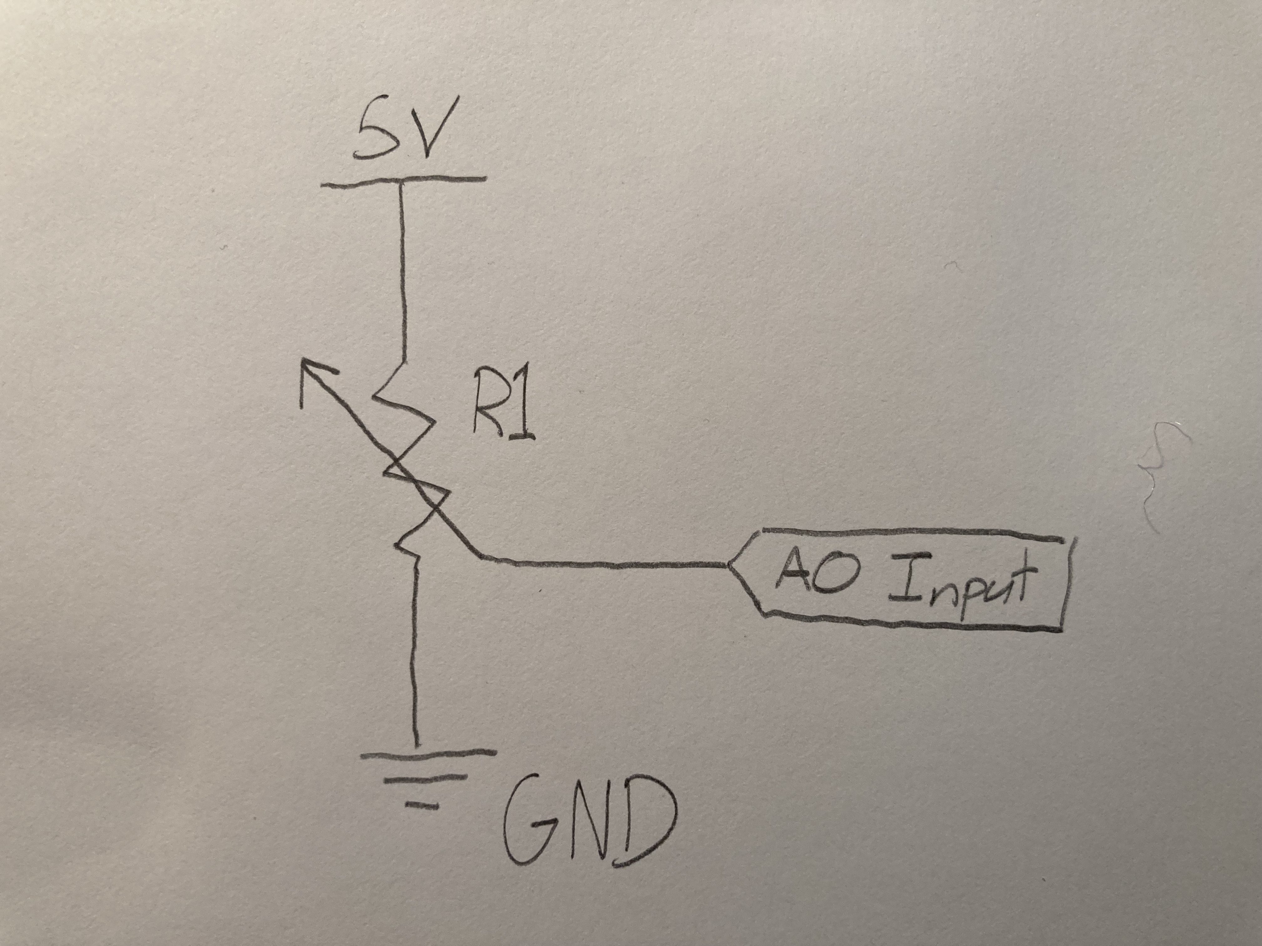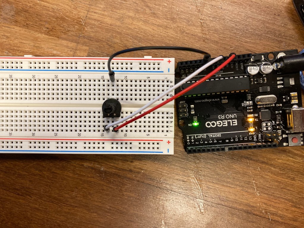 The first part of this lab had me set up a simple potentiometer connected to the Arduino microcontroller. The 5V power connects through the potentiometer which creates a variable resistance depending on how much the knob is turned. The input pin is connected to the A0 analog pin on the microcontroller which allows me to get the reading between 0-1023 to measure how much resistance is being applied to the current.