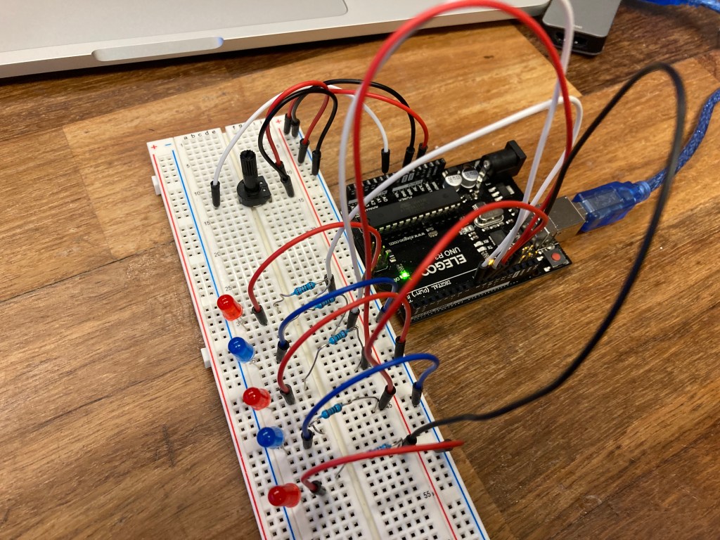 Next, I set up a row of 5 LED lights to work with the potentiometer. The 5V power runs through the potentiometer first, and then connects down the positive side of the breadboard to connect to the 5 LED pins. I used 220 Ohm resistors to connect the LED back to the microcontroller. These LED’s are plugged into the digital pins 8-12 to control when they light up using the digitalWrite() function.