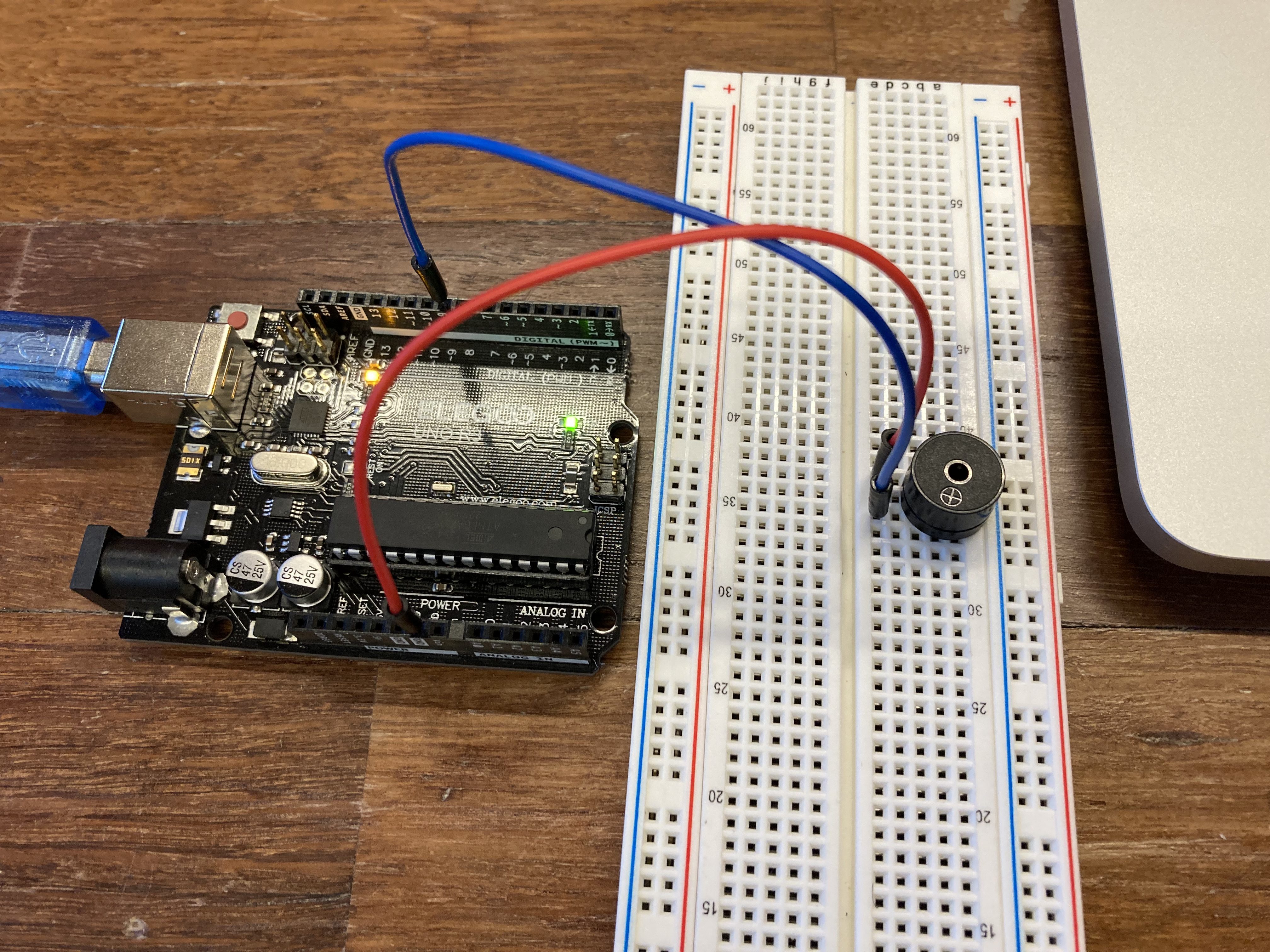 Next, I used the Passive Buzzer from the Arduino kit to get an audible analog output. The passive buzzer is a type of speaker that can be used to generate sounds of different frequencies. I connected the buzzer pin to input analog PWM signals so that I may change what frequency goes into the buzzer. A demonstration of the buzzer beeping for 1 second intervals at 440 Hz (A4 key).