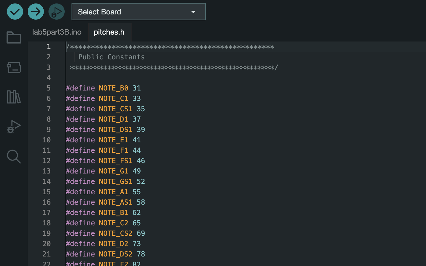 In order to change the frequency, I used a .h file included in the main Arduino code that contained the music notes linked with the appropriate frequency value. To use the ‘pitches.h’ file with the Arduino.ino file, both files need to be saved in the same folder and included in the .ino file.