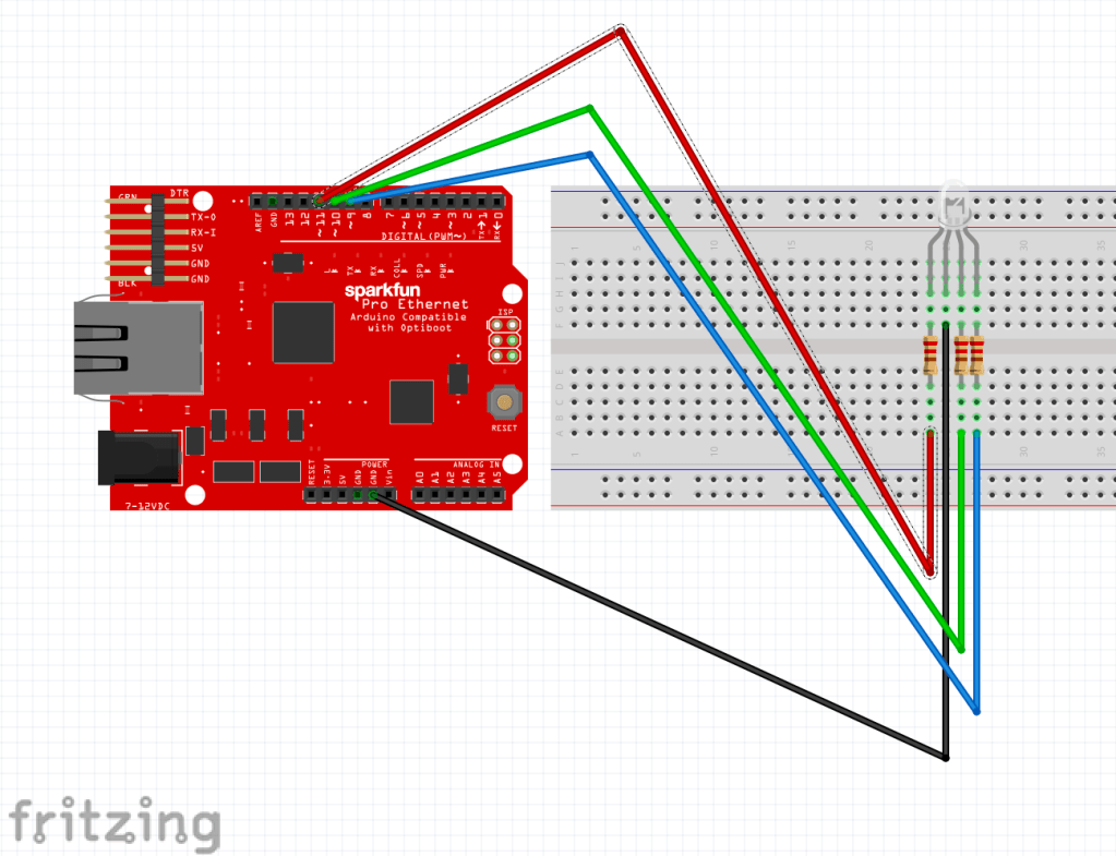 For the first part of this lab, I connected an RGB LED to the Arduino Microcontroller. With the RGB light, I had to connect each Red, Green, and Blue pin individually back to the Arduino. For the Red, I used a 100 Ohm resistor, and two 200 Ohm resistors for the Green and Blue since each connection had different amounts of voltage used to power the LED. These wires needed to be connected back to the Arduino with the pins marked with a ‘~’, indicating that they support Pulse-Width Modulation to control an analog output to the LED. A Fritzing schematic can be seen below along with the actual set up for the board.
