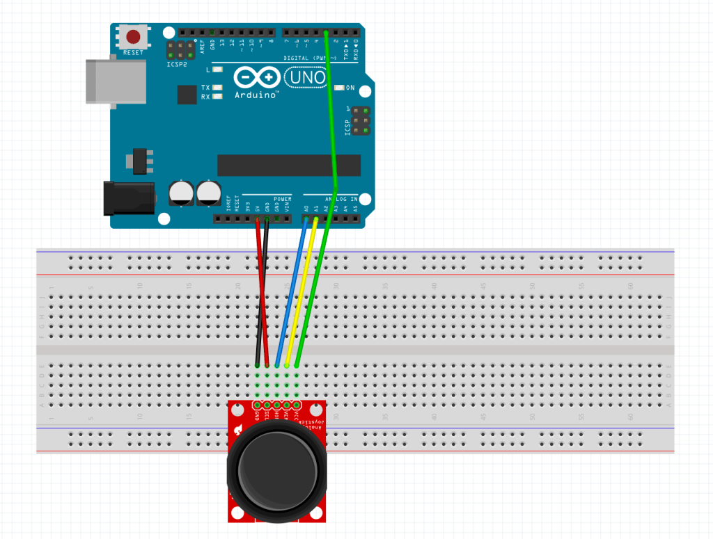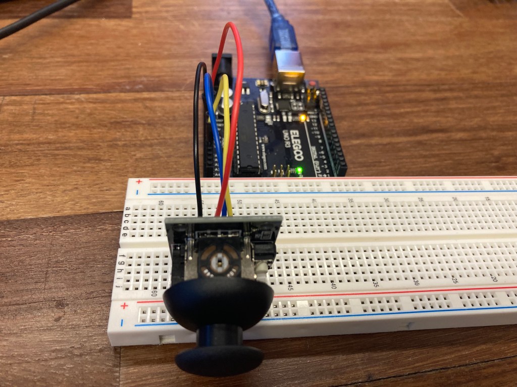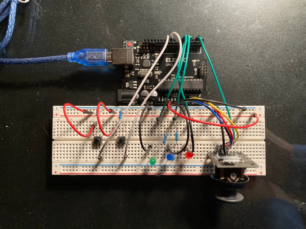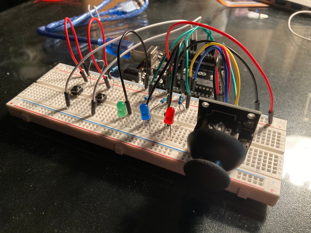 For the final part of this lab, it required us to crate my own visualization using the Processing library. I used two push buttons along with the joystick for the electronic inputs and three LED’s (red, green, blue) as electronic outputs. The Visualization would work similar to the previous parts that would move a circle according to the position of the joystick. When the left button is pushed, it would change the color of the circle to blue and the blue LED would light up. The right button would do the same but change the circle color to red and the red LED would light up. Finally, pushing the joystick in would change the circle to green and light up the green LED.