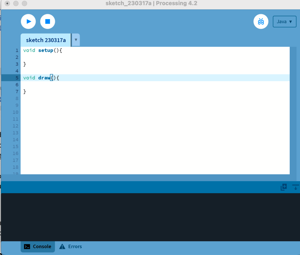 For this lab, I used Processing Development Environment to create serial communication between the Arduino and a computer processor. I downloaded the software from their website and opened up the IDE to begin writing code. The setup() and draw() functions are similar to the setup() and loop() functions in the Arduino IDE.